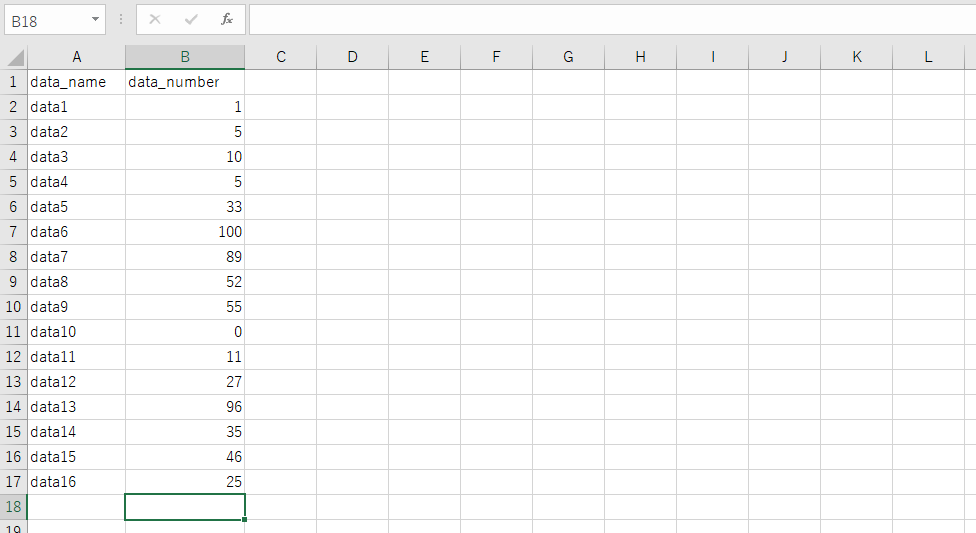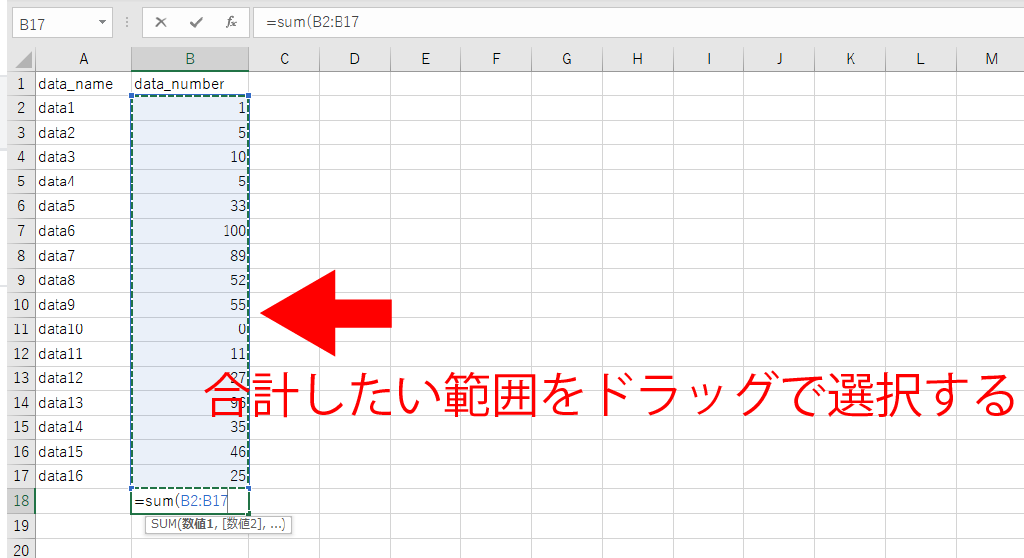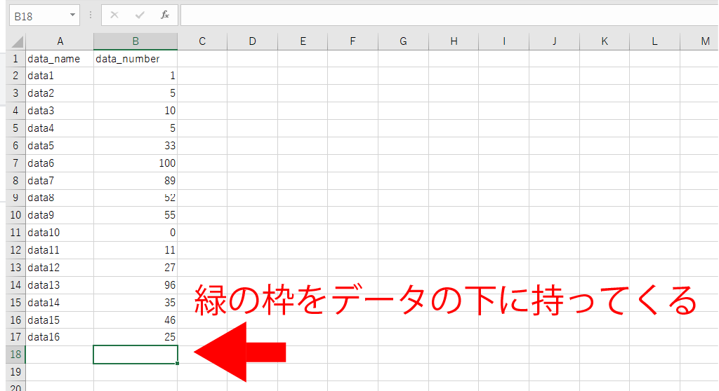 まず、合計したいデータがある「data_number」の最後のデータの一段下にカーソルを合わせる。(緑の枠をデータの下に合わせる)