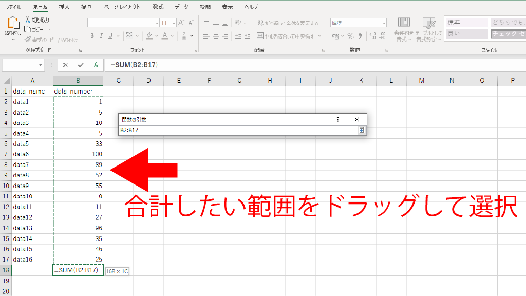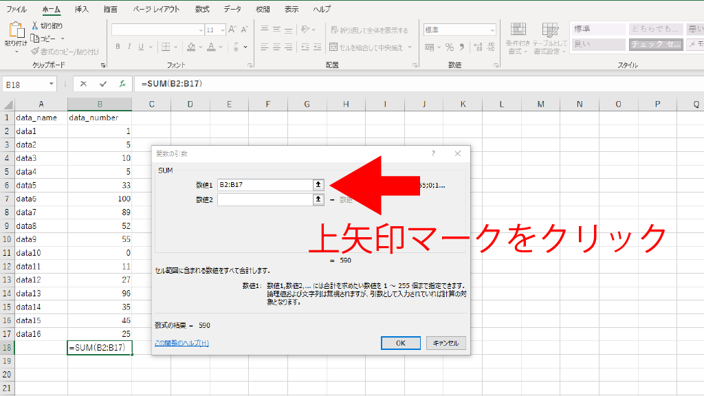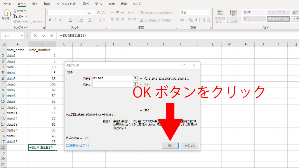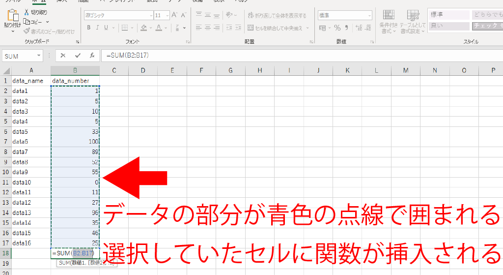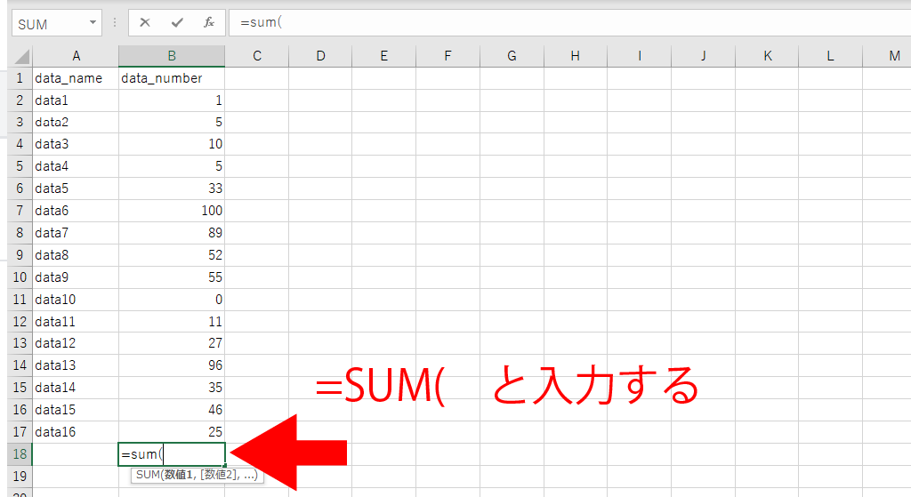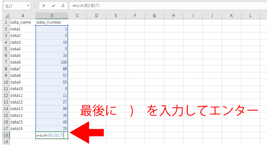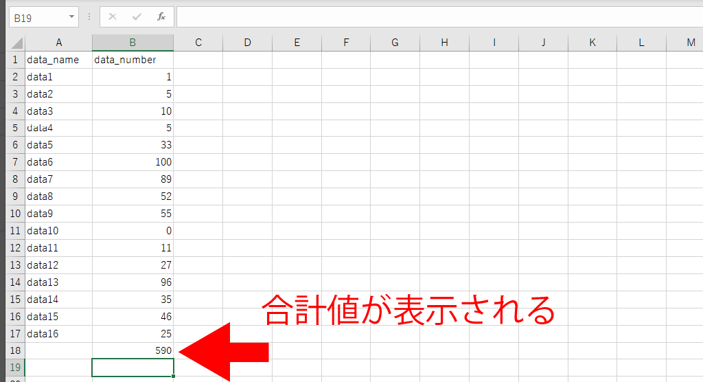 今回は分かりやすく説明するため、データの一番下のセルに表示させますが、特にセルに指定はないので、好みのセルで実行してみてください。