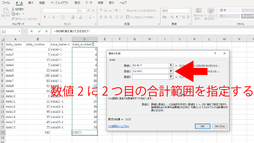複数の範囲を合計するときは、数値2にも合計範囲を追加することで離れた場所の値も合計することができます。
