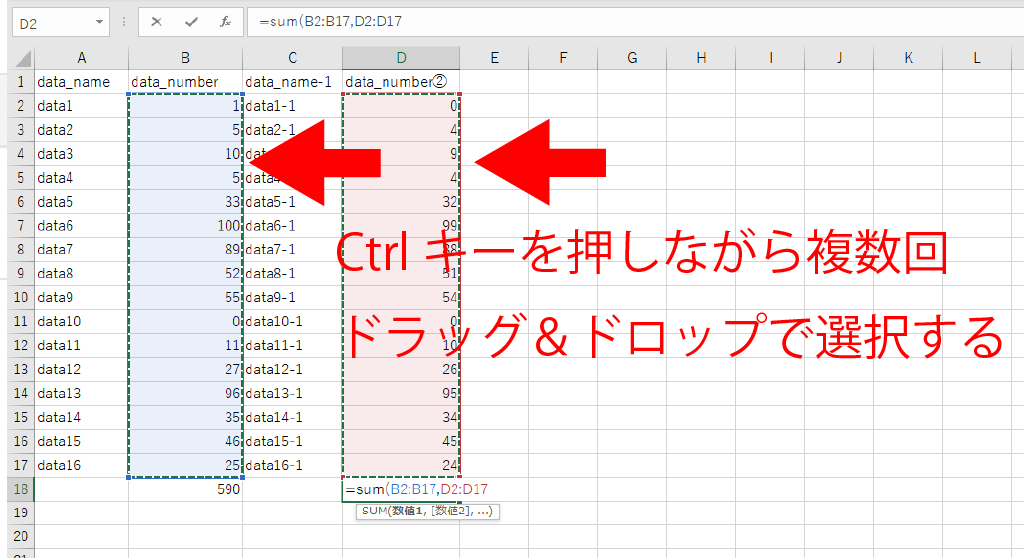 複数範囲の選択を行いたい時は、合計したい範囲をドラッグ&ドロップする際、Ctrlキーを押した状態で選択すると、分割された範囲を選択することができ、それが合計されます。