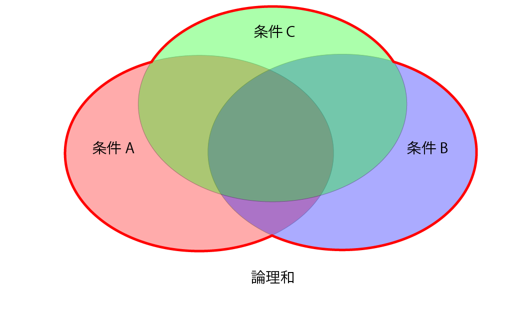 こちらでは条件Aもしくは条件Bもしくは条件Cのいずれか、あるいはその一部、あるいはその全部が重なっている部分(赤枠で示した部分)が論理和となります。